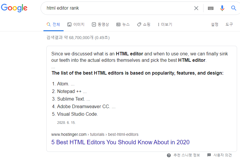 구글에 Html editor rank 라고 검색하면 다음과 같은 결과를 얻을 수 있습니다.