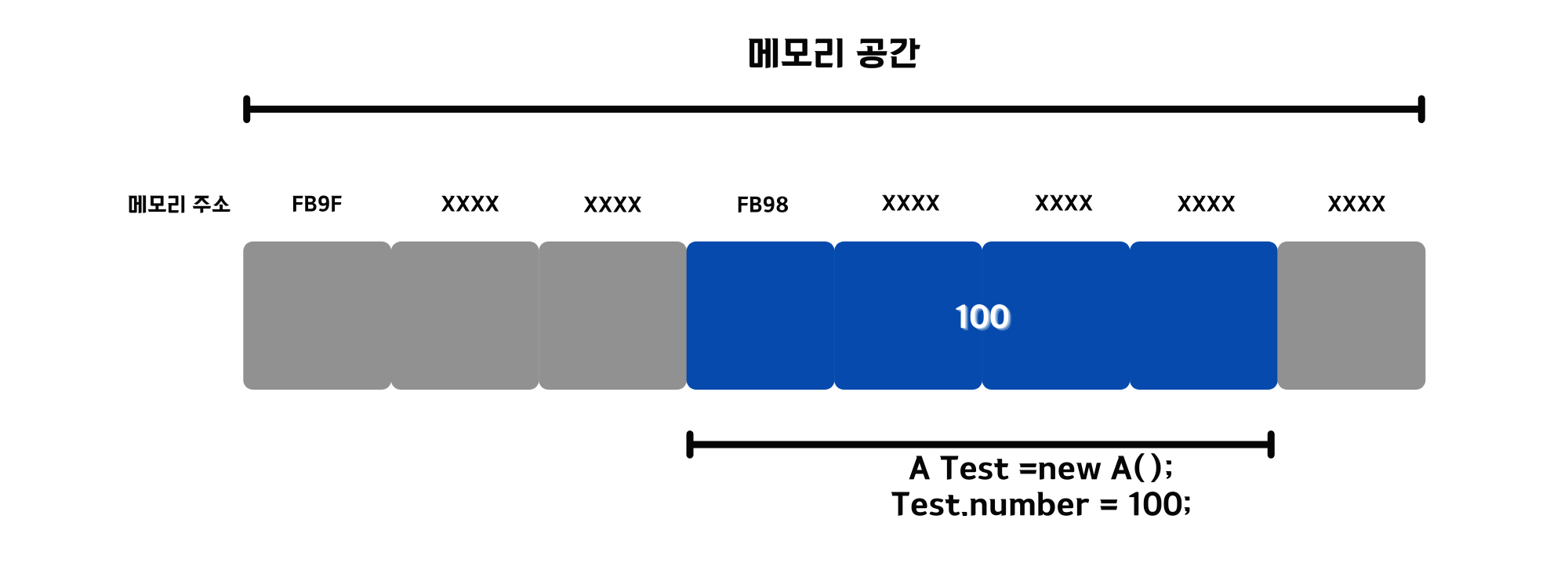 선언된 클래스 A를 인스턴스 변수 Test로생성을 하게 된다면 메모리 공간에서는 그림과 같이 될 것입니다. 그리고 정리하자면 아래와 같습니다.