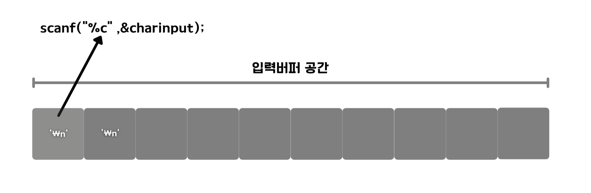 scanf(" %c",&charinput); //위와 차이점은 스페이스 하나뿐위와 같은 식으로 scanf함수를 이용하면 입력 버퍼 중 공백과 개행 문자를 무시하고 처음으로 만나는 문자의 값을 취하겠다는 뜻입니다.