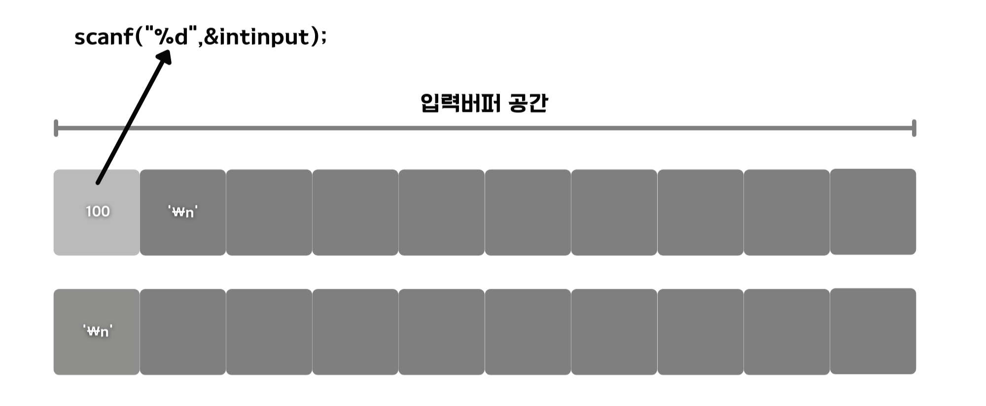 이때 우리는 scanf 함수를 이용하기 위해 엔터를 눌렀습니다. 그리고 이 엔터 또한 키보드 입력 버퍼 공간에는 줄 넘김을 표현하기 위한 개행 문자인 '\n'이 입력되어 있습니다.
