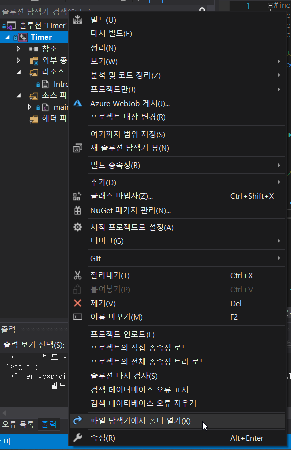VisualStudio에서 해당 소스코드가 들어있는 설루션을 우클릭하여 폴더를 열 수 있습니다.
