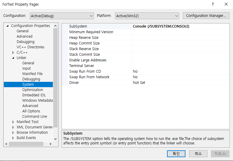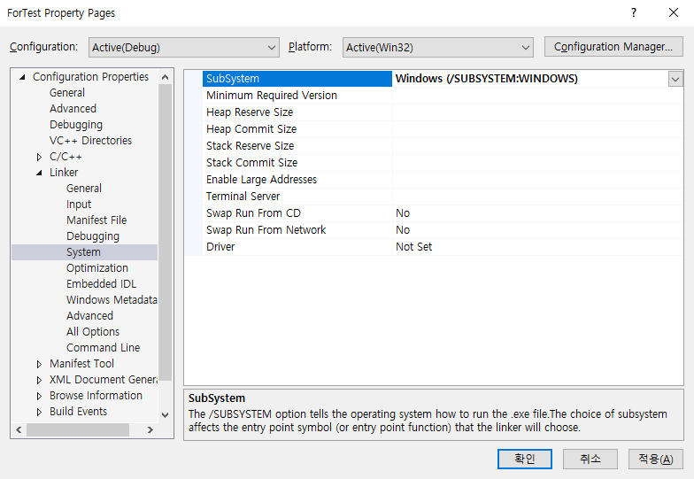 위처럼 하고 적용을 하면 '빈 프로젝트' 즉, 콘솔용 프로젝트를 만들었어도 다시 링커 부분의 설정을 변경해 주어 IDE에서 이 소스코드는 Win32를 위한 소스코드라 생각하고 그에 맞에 빌드를 진행하여 정상적으로 동작할 수 있습니다.