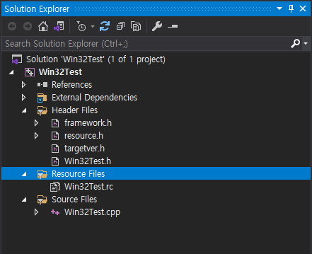 프로젝트 명과 동일한 .rc 파일과 resource.h 파일이 생성됩니다.