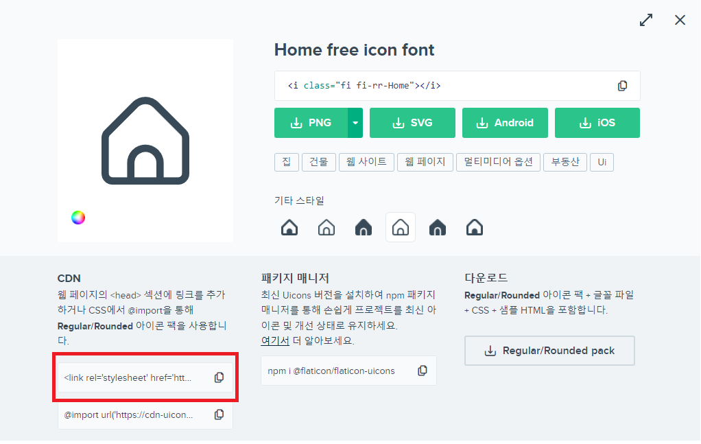 복사한 링크를 HTML에 삽입하고, 태그를 등록하면 손쉽게 아이콘을 불러와서 사용할 수 있습니다.