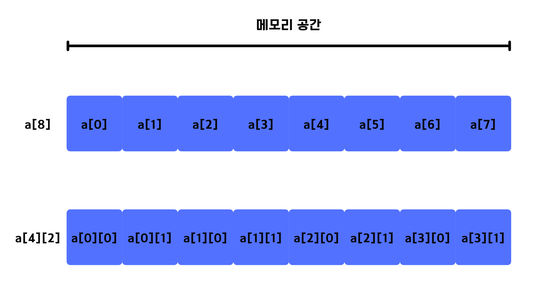 다차원 배열은 추상적인 개념입니다. 위의 예제의 배열은 총 8개의 int형 변수의 묶음입니다. 우리가 보기 쉽게 하기위해서 면의 형태로 구현을 한 것뿐이지 실제 메모리 구조는 면의 형태가 아니기 때문에 순차적으로 만들어 집니다.