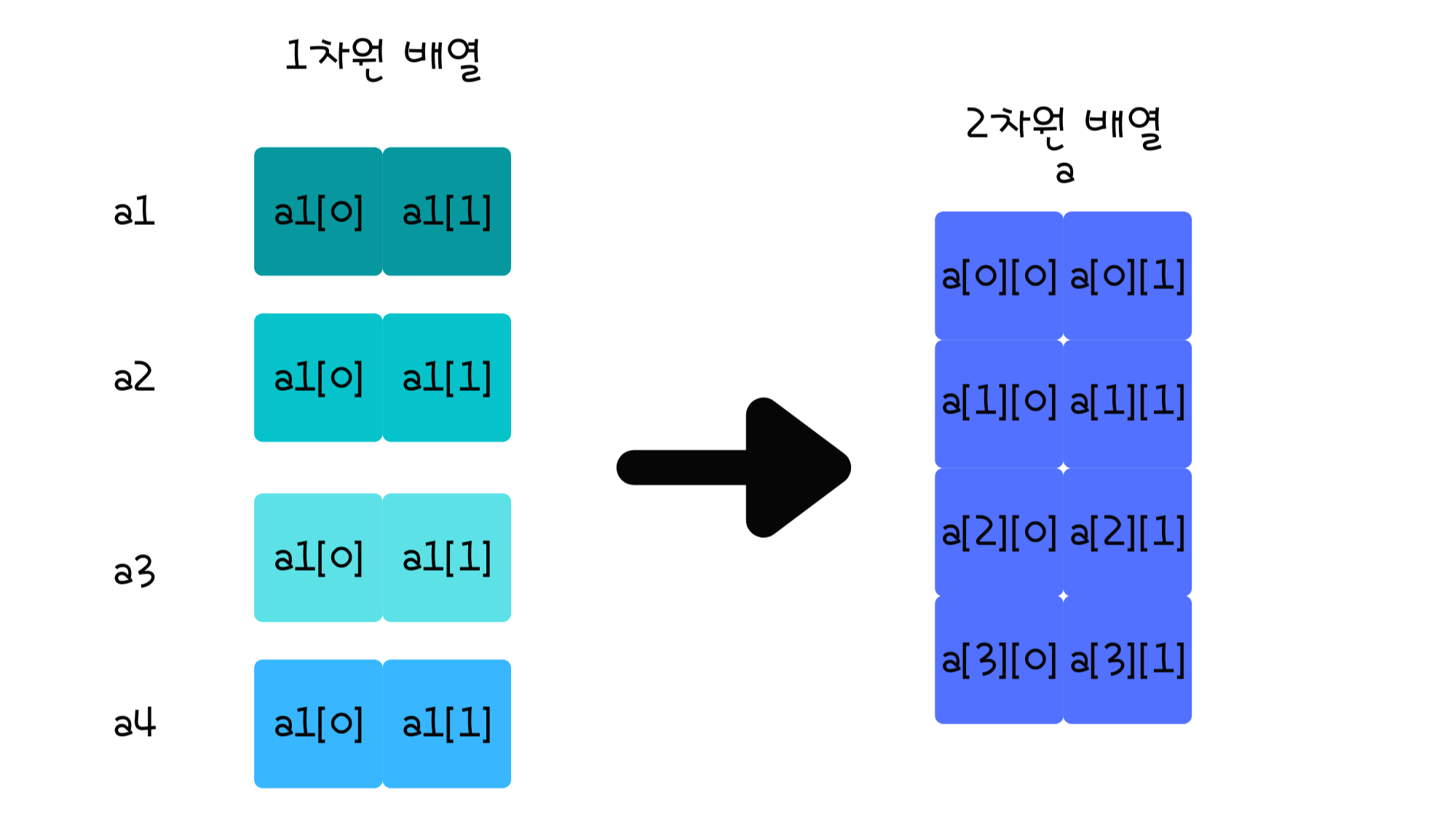 이제 이 배열을 2차원 배열로 묶어 보도록 하겠습니다.